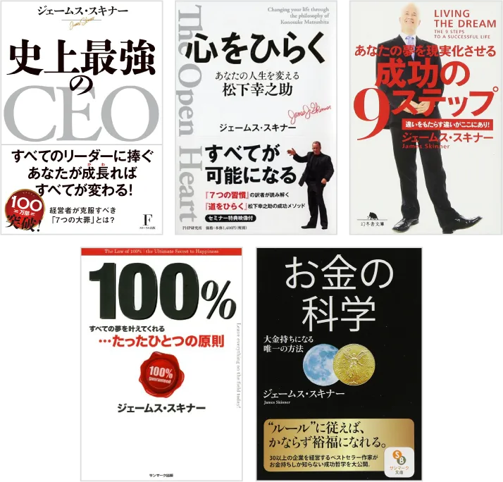 『7つの習慣』の和訳、『史上最強のCEO』、松下幸之助『道をひらく』の続編にあたる『心をひらく』の執筆を初め、『成功の9ステップ』『100%』『お金の科学』など、多くの名著を生み出す350万部ベストセラー作家。日本で初版100万部を記録している書籍は「ハリーポッター第6巻」とジェームス・スキナー著の「史上最強のCEO」のみである。